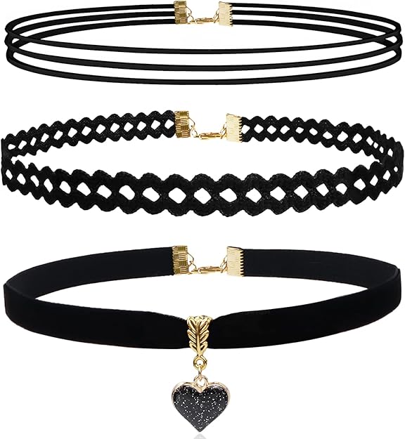 Stylish Choker Set: This set includes 3 elegant choker necklaces in classic black, featuring a striped design, intricate crochet pattern, and a velvet choker with a heart pendant charm.